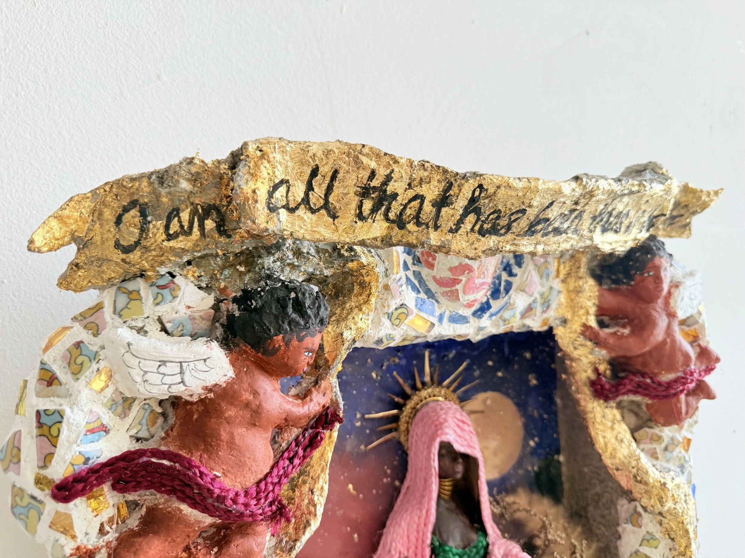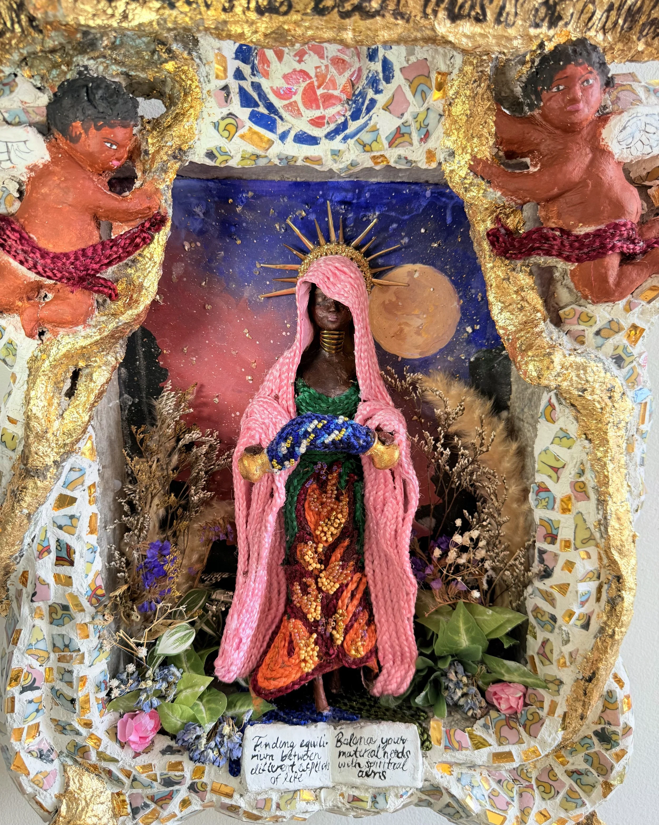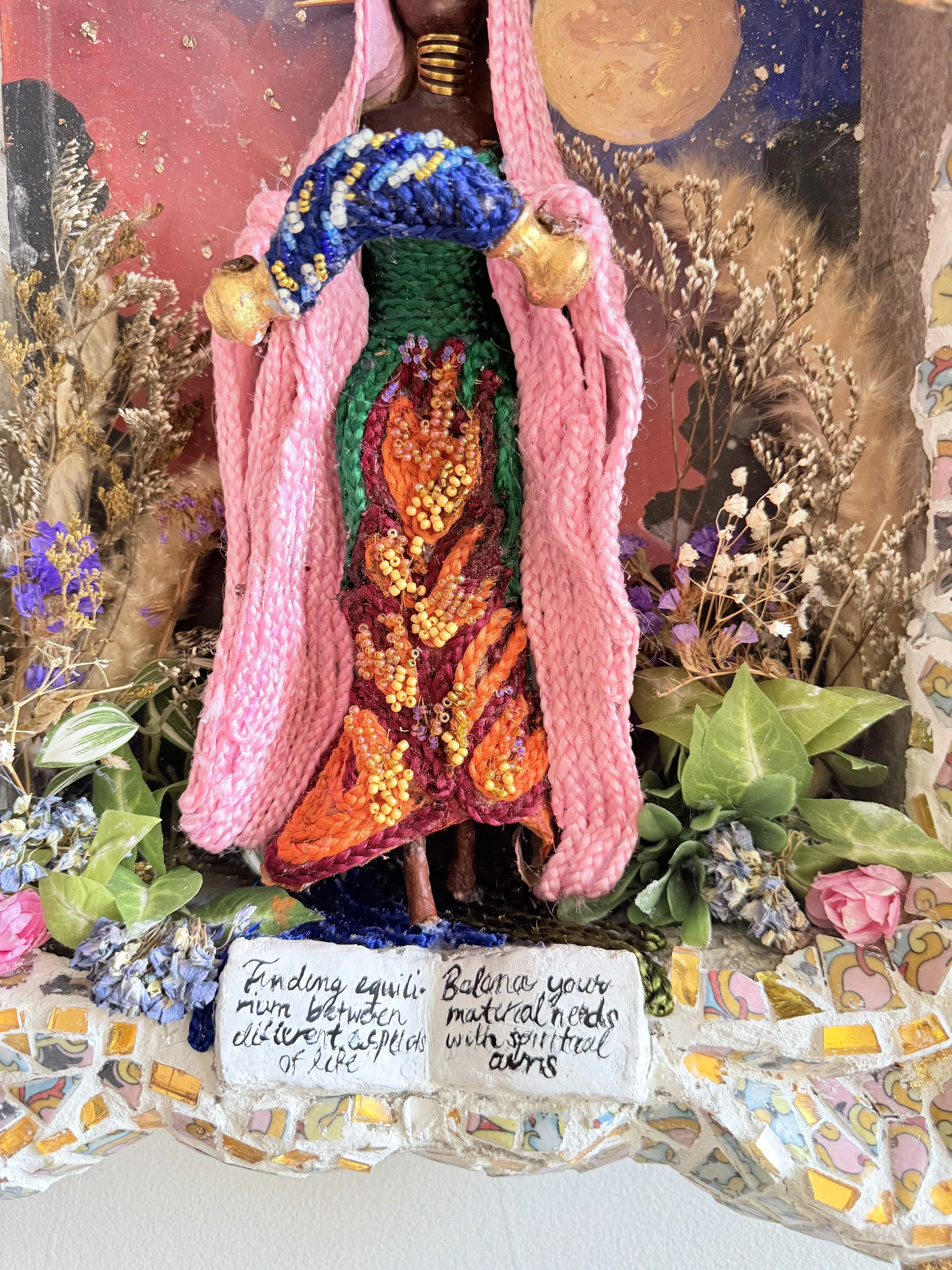 This altar invokes the archetype of Temperance as a practice of balance and integration. One foot rests on land, the other in water, embodying the union of body and spirit. Flames woven into the dress, flowing water between cups, and the presence of air and earth through plants and open space bring the four elements into harmony. The inscription “I am all that has been, that is, and that will be” echoes the goddess Isis, whose voice speaks of eternal becoming. Here, material and spiritual needs intertwine, offering a meditation on how to nourish the soul while living in a world of imbalance.